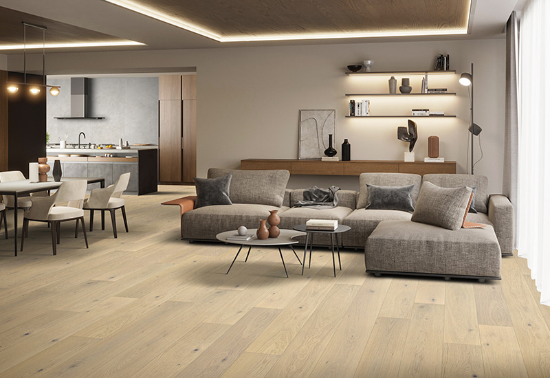 PER SAPERNE DI PIÙGimli Oak White Light Spazzote ingegnerizzato Pavimenti in legno Lo strato di superficie è realizzato con quercia bianca accuratamente selezionata, rinomata per la sua bellezza naturale, durata e motivi di grano distintivi. Il processo di spazzolatura leggera migliora la texture del legno, fornendo una risha sottile ma elegante di tattile e evidenziando il suo fascino organico. o deformazione. Questo design garantisce che il pavimento rimanga resistente e affidabile in vari ambienti, comprese le aree con livelli di umidità fluttuanti. La tecnica di spazzolatura leggera aggiunge profondità e carattere al legno, creando un aspetto moderno ma naturale che integra perfettamente qualsiasi stile di interior design. $ .